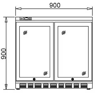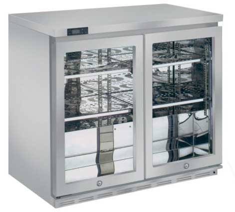 Stainless steel refrigerated cabinet untuk display botol dan minuman yang biasa diletakan di bagian belakang bar. Dirancang khusus untuk dapat digunakan pada peletakkan yang rapat ke dinding (indoor)
