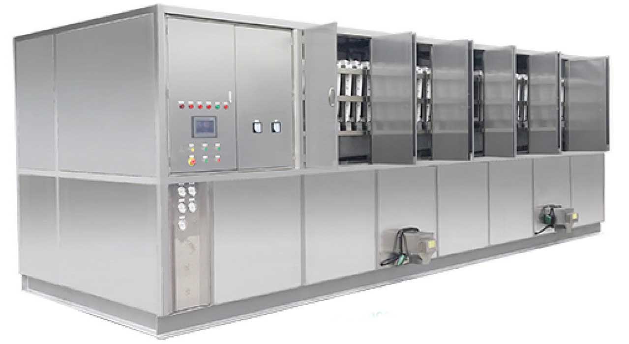 Mesin yang berfungsi untuk membuat es batu berbentuk kubus. Cocok digunakan untuk pabrik es batu yang dijual dalam kemasan kantong. Kapasitas tempat penyimpanan es dapat menampung produksi tiap 2 jam. Mesin akan berhenti jika bin-nya sudah penuh