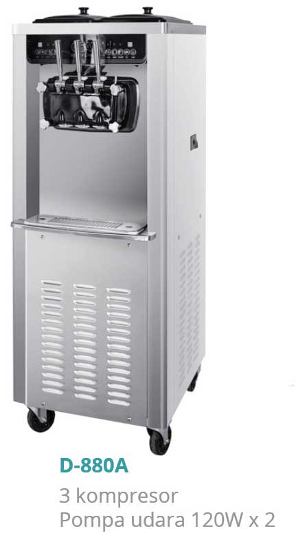 Khusus D-880A dilengkapi pompa udara yang berguna untuk membuat es krim lebih mengembang sehingga irit pemakaian bahan (overrun 50%) atau membuat es krim cone yang tinggi.