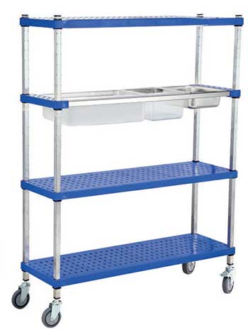Trolley 4 rak serbaguna untuk menaruh aneka produk, rangka dari stainless steel, modul rak plastik mudah dilepas bisa diganti dengan GN Pan ukuran GN1/1. 1/3, 2/3 (Tidak Termasuk).