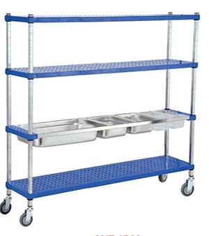 Trolley 4 rak serbaguna untuk menaruh aneka produk, rangka dari stainless steel, modul rak plastik mudah dilepas bisa diganti dengan GN Pan ukuran GN1/1. 1/3, 2/3 (Tidak Termasuk).