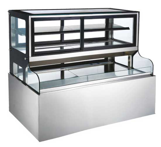 Showcase pendingin dengan dual fungsi dan akses, bagian chest untuk memajang minuman, sedangkan superstructure atas untuk memajang kue atau pastry