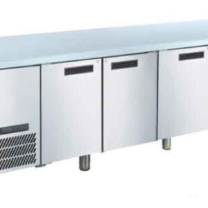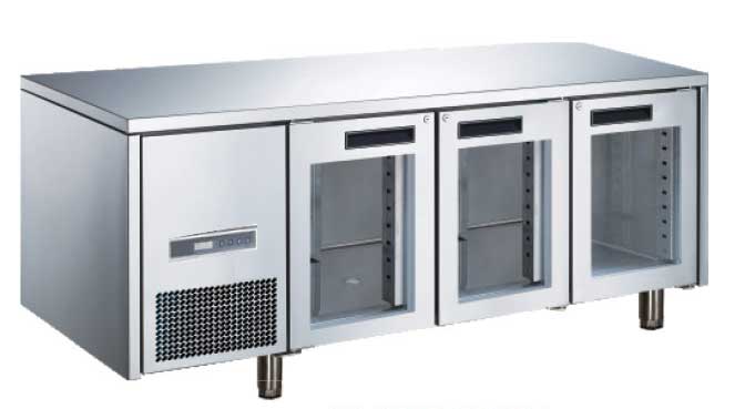 Stainless steel refrigerated cabinet berbentuk meja untuk menyimpan minuman kemasan, sayuran, buah, susu, dll yang biasa diletakkan pada area kerja bar.