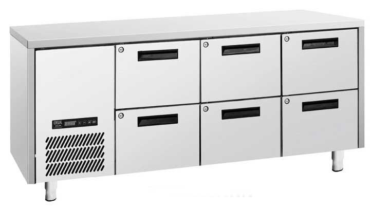 Stainless steel refrigerated cabinet berbentuk meja yang dilengkapi dengan laci geser untuk mempermudah akses pengambilan dan pengaturan barang.