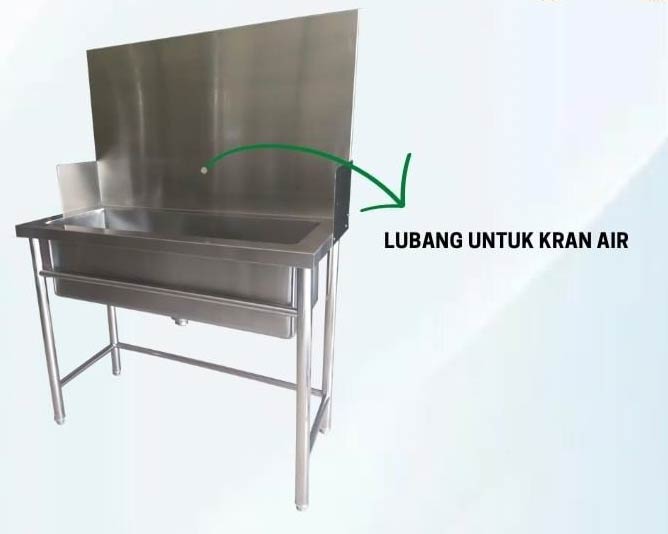 Pot Sink dengan splash back tinggi dan dilengkapi dengan cross bar serta plat di sisi kanan kirinya. Terbuat dari bahan stainless steel tahan lama dan mudah dibersihkan. Lubang Kran air dipasang di splash back.