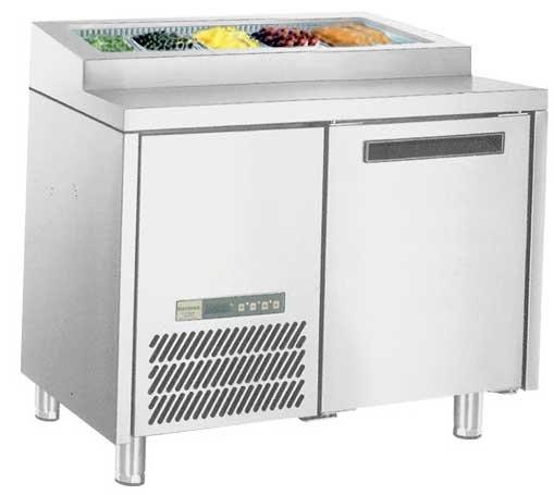 Stainless steel refrigerated cabinet berbentuk meja dengan tambahan kompartemen atas untuk meletakkan berbagai variasi topping dan kabinet bagian bawah yang bisa digunakan untuk menyimpan daging, sayuran, buah, susu, minuman kemasan, dll.
