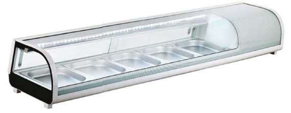 Kabinet pendingin dengan desain sudut alas yang bundar, digunakan untuk memajang sushi agar tampil menarik sekaligus menjaga kualitas sushi (digunakan untuk display, bukan untuk penyimpanan)