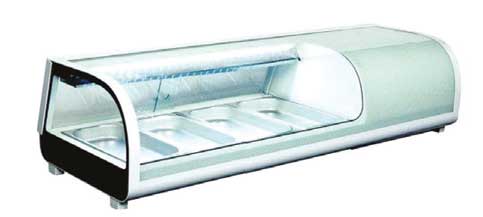 Kabinet pendingin dengan desain sudut alas yang bundar, digunakan untuk memajang sushi agar tampil menarik sekaligus menjaga kualitas sushi (digunakan untuk display, bukan untuk penyimpanan)