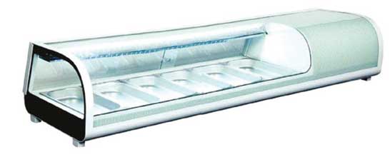 Kabinet pendingin dengan desain sudut alas yang bundar, digunakan untuk memajang sushi agar tampil menarik sekaligus menjaga kualitas sushi (digunakan untuk display, bukan untuk penyimpanan)