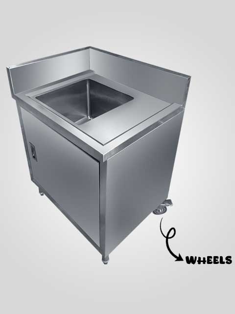 Sink Table dengan Cabinet Stainless dilengkapi dengan Splash Back, Pintu (Swing), & Wheels (Roda Belakang). Digunakan untuk dapur komersil.