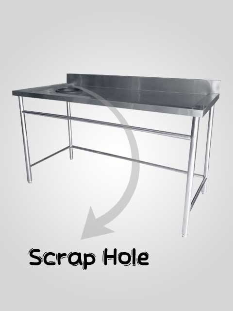 Soiled Table adalah Meja stainless untuk piring kotor yang dilengkapi dengan Scrap Hole atau Lubang Pembuangan Sampah. Meja ini sering digunakan di Cafe, Restoran, Rumah Sakit, Rumah Makan, Dll. Material stainless yang kuat & tahan lama juga mudah dibersihkan.