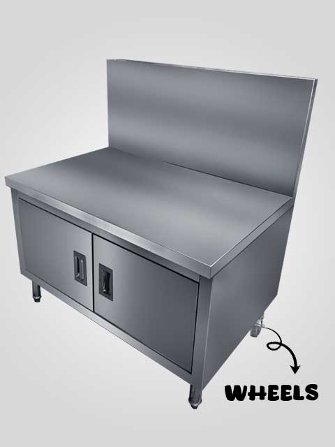 Meja Kompor yang terbuat dari Stainless Steel dengan Splash Back besar digunakan untuk menahan panas api ke arah dinding serta dibuat Roda Belakang (Wheels) juga Cabinet di bawahnya untuk keperluan dapur komersil. Kokoh dan kuat yang cocok diletakan kompor di atasnya.