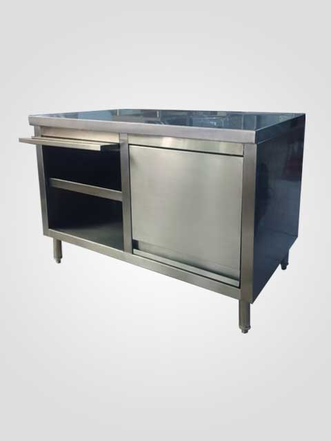 Lemari stainless yang dilengkapi dengan pintu geser, di mana pintu tersebut dapat digulung ke atas untuk membuka atau menutup ruang penyimpanan. Desain ini mirip dengan pintu garasi, di mana pintu bergerak secara vertikal ke atas dan menggulung di dalam ruang yang tersembunyi di bagian atas kabinet.