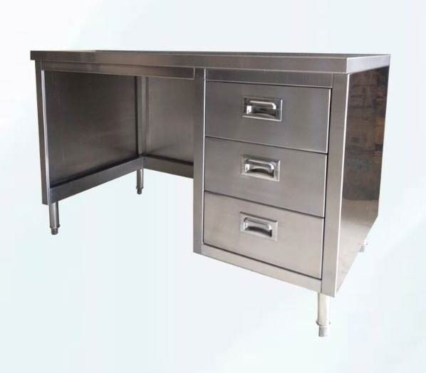 Meja kabinet stainless steel dibuat dengan tipe terbuka tanpa Splash Back dilengkapi dengan 3 drawers/laci dan handle. Bahan full stainless steel anti karat dan food grade. Kabinet ini bisa digunakan sebagai meja kerja dan ruang yang kosong bisa digunakan untuk menyimpan barang.