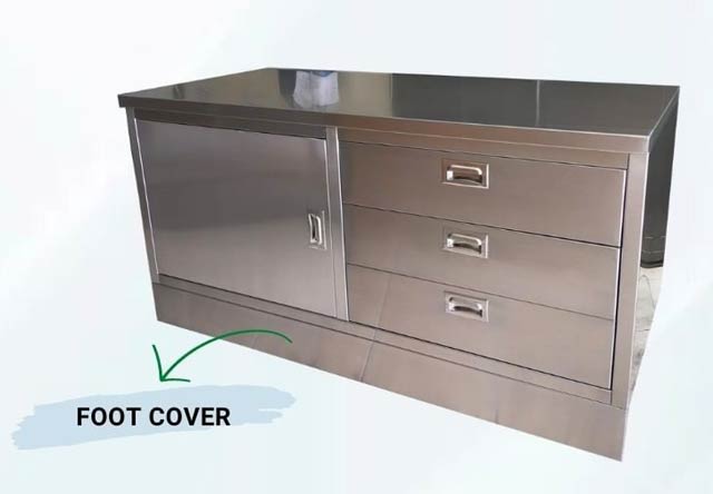 Meja cabinet stainless tanpa splash back dilengkapi dengan pintu swing dan 3 laci dan penutup kaki (foot cover). Bahan full stainless steel anti karat dan food grade. Meja ini dapat digunakan untuk menyimpan bahan makanan ataupun peralatan dapur berukuran kecil maupun besar.