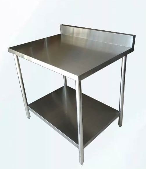Meja Stainless dengan splash back dan 1 hambalan. dibuat dari bahan material stainless steel anti karat dan food grade sehingga aman bersentuhan langsung dengan makanan. Meja ini digunakan untuk meja kerja atau untuk menyimpan bahan baku.