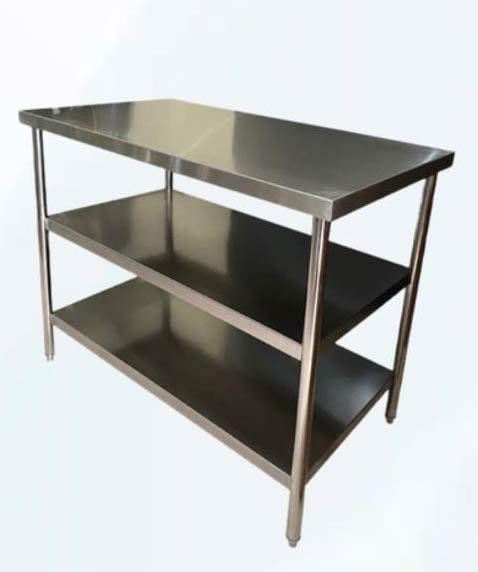 Meja Stainless tanpa splash back dengan 2 hambalan. Dibuat dari bahan material stainless steel anti karat dan food grade. Sehingga aman bersentuhan langsung dengan makanan. meja ini digunakan untuk meja kerja atau untuk menyimpan bahan baku.