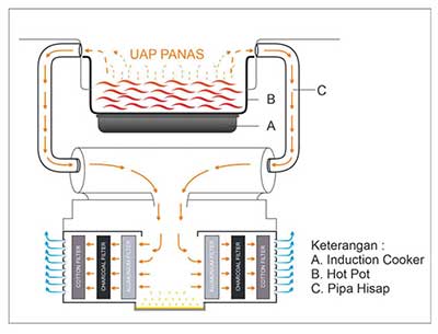 Stainless steel Pot dengan teknologi memasak tanpa asap, dengan 8 pipa hisap mampu menghisap uap proses memasak yang mengandung minyak sehingga pertikel asap disaring melalui box pemurnian actived filter (aluminium filter, actived charcoal filter, dan cotton filter) untuk penyerapan optimal, juga sinar UV mampu membunuh bakteri dan virus. Menjadikan kenyamanan saat menyantap hidangan yang sehat dan higienis di Restoran.